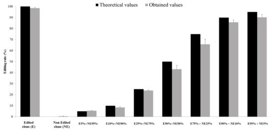 Then, we generated clones (see below) expressing edited and non-edited genome sequences that were mixed at different ratios, respectively: 0%/100%, 5%/95%, 10%/90%, 25%/75%, 50%/50%, 75%/25%, 90%/10%, 95%/5%, 100%/0%. Each different mixture was analyzed 8 times in the same experiment.
