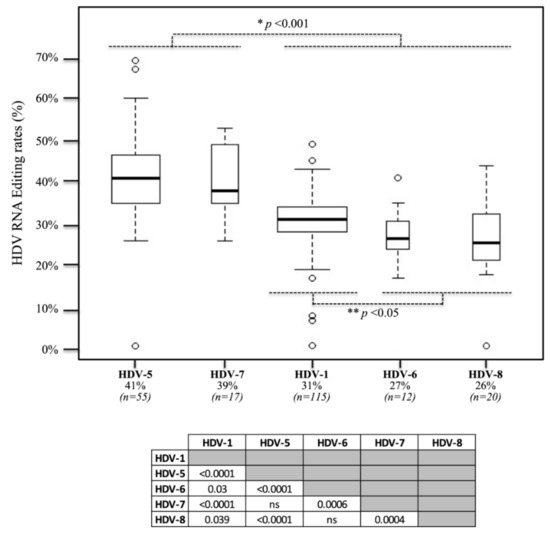Plasma HDV RNA editing rates according to the HDV genotype. Two-hundred and nineteen samples from untreated infected patients were analyzed. The box plots, generated with ggplot2 application, show the median editing rate and the value distribution obtained with different genotypes. Significantly higher editing rates (expressed in percentage) were observed for HDV-5 and HDV-7 strains, compared to HDV-1 (African and non-African genotypes), HDV-6 and HDV-8 (* p < 0.001). In addition, HDV-6 and HDV-8 editing rates were significantly lower than HDV-1 ones (** p < 0.05). Comparison of editing rates was performed by means of Kruskal–Wallis, chi-square, and Wilcoxon’s tests.