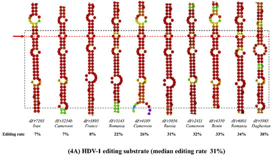 The editing process involves several structural requirements that are described in the introduction. RNA secondary structures can differ according to the HDV genotype, as described earlier [9,21,38]. Indeed, loops of variable sizes are directly displayed at the vicinity of the editing site and downstream, disrupting base pairing that is essential for ADAR-1 binding. We characterized full-length viral genome sequences from 32 of the 219 samples, selected to represent different HDV genotypes and according to different editing rate levels. Then, we analyzed the more stable RNA secondary structures of their antigenomic sequence, with the main focus on the so-called “minimal substrate for editing” (Table 2 and Figure 3). The structures were identical whatever the application used, RNAfold or UNAfold. The 32 different structures according to genotypes are presented based on RNAfold analysis in Figure 4.