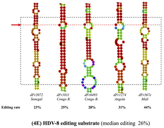 Based on our predicted structural analyses, our results are supported by at least two RNA structural features described in Figure 4 and Table 2. First, the A-C mismatch pair at the amber/W site, which is key in the editing process of HDV-1 strains, is also present in HDV-5 and HDV-7 strains. Interestingly, this mismatch is accentuated in the HDV-7 amber/W codon, because it is located at the top of a large bulge, whereas the mismatch is disrupted in HDV-6 and some HDV-8 sequences which have the lowest editing rates. In addition, in the 25 nt-long-region downstream the editing codon, we found two or three strict base-pairing motifs, allowing for optimal binding of the host ADAR-1 editing enzyme. Surprisingly, the HDV-7 editing motif of one strain (dFr7024 strain) displayed a complex branched structure composed of two stem-loops flanking a base-pairing motif. The editing capacity of this strain appeared to be lower than that of the four other HDV-7 strains (Figure 4D). Such a structure with two stem-loop arms, has been previously proposed to be a transient secondary structure of the HDV RNA used by HDV-3 strains to improve their editing efficiency by ADAR-1 [19,20,21,39]. Therefore, we hypothesize that this conformation observed in a single HDV-7 strain could be optimal for its editing capacity. Whether different genotypes can transiently use this alternative conformation to up- or down-regulate their RNA editing efficiency remains to be determined. Interestingly, HDV-6 and HDV-8 strains, which did not display the A-C mismatch pair at their amber/W site, could use such transient conformation to increase the binding efficiency of host ADAR-1 to its substrate.