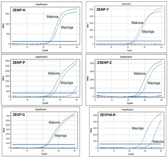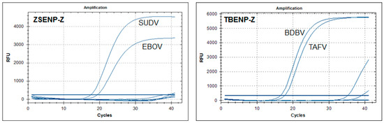 To evaluate the specificity of these assays, cross-reactivity was examined using a variety of mimic viral RNA including Marburg virus (MARV), SUDV, TAFV, BDBV and RESTV (Table S1, Supplementary Materials). Marburg viruses can either cause similar symptomatology to ebolaviruses or could be a possible differential diagnosis to EVD. Each set showed highly positive fluorescence signals in the Ct range of 11.99–22.21 according to its own template, i.e., the RNA extracted from cells transfected with a specific gene expression plasmid. No cross-amplification reactions were observed. ZSENP-Z and TBENP-Z were designed to be simultaneously specific for two EBOV species. ZSENP-Z for EBOV and SUDV, whereas TBENP-Z for TAFV and BDBV (Table 5 and Figure 1).