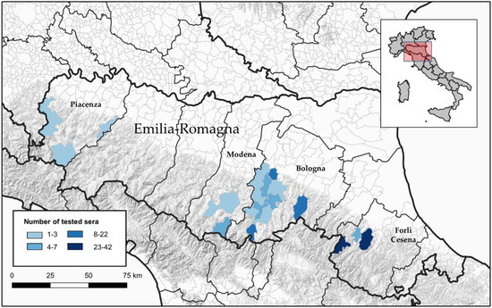 A total of 211 serum samples from different animal species (dogs, goats and sheep), collected in 2019, were tested by a VNT for the viral strains of interest. We obtained these samples by exploiting IZSLER diagnostic activities (especially for the control of sheep brucellosis), mainly in the pre-Apennine hills, where viruses used in VNTs have been isolated (Figure 1). Specifically, the 211 serum samples from dogs (23), sheep (165) and goats (23) originated from the provinces of Bologna (18 dogs, 37 sheep and 23 goats), Forlì-Cesena (5 dogs and 109 sheep), Modena (9 sheep) and Piacenza (10 sheep).