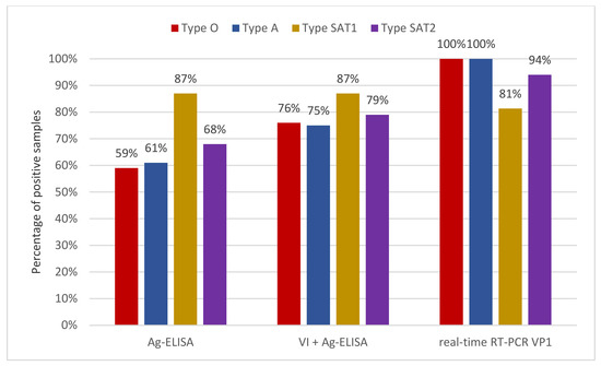 Although Ag-ELISA is characterised by lower sensitivity compared to other assays, in our study it was able to detect and type six samples (3 type A, 2 SAT1, and 1 SAT2), which were undetected by VI, likely because of poor or lost virus viability in these specimens.
