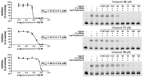Our in vitro RdRp assay confirmed the inhibitory effect of compounds HeE1-2Tyr (16), 17, and 18 against SARS-CoV-2 polymerase. The compounds were initially tested at one concentration (100 µM), which confirmed that compounds HeE1-2Tyr (16), 17, and 18 inhibit SARS-CoV-2 RdRp. Subsequently, the RdRp assay was used to determine the IC50 values. Surprisingly, compound HeE1-2Tyr (16) was found to be the best inhibitor, with IC50 of 27.6 ± 2.1 µM, while the inhibition effect of compound 18 was rather weak (IC50 = 85.5 ± 2.0 µM, Figure 1).