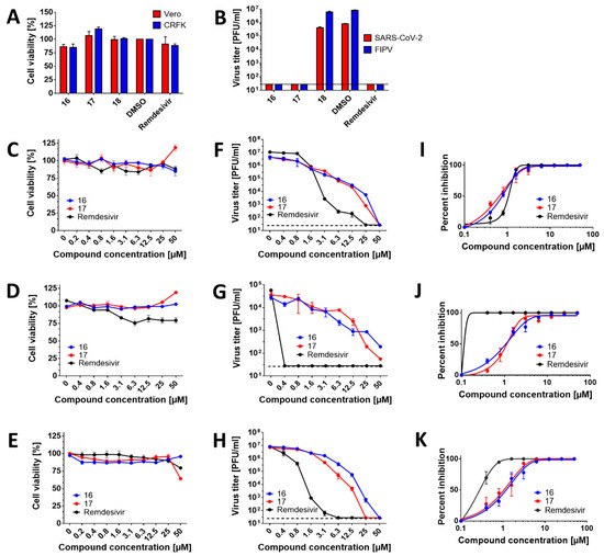 Antiviral efficacy and cytotoxicity of the studied RdRp inhibitors in cell-based assays. (A) Cytotoxicity of the indicated compounds in Vero and CRFK cells. The cell monolayers were treated with the compounds (50 µM) and incubated for 48 h. The cell-mediated conversion of tetrazolium salt WST-8 to formazan was monitored by absorbance measurement (450 nm). Cytotoxicity was expressed in terms of cell viability percentage. (B) Anti-SARS-CoV-2 and anti-FIPV efficacies of the indicated compounds in Vero and CRFK cells, respectively. The cell monolayers were treated with the compounds (50 µM), infected with the respective virus at a MOI of 0.1, and incubated for 48 h. The supernatant media were collected, and viral titers were determined by plaque assays. (C–E) Dose-dependent cytotoxic effects of the compounds in Vero (C), CaCo-2 (D), and CRFK (E) cells. The cell monolayers were treated with the compounds in the concentration range from 0 to 50 µM and incubated for 48 h. Cytotoxicity was determined, as described for (A). (F,G) Dose-dependent anti-SARS-CoV-2 activity of the compounds in Vero (F) and CaCo-2 (G) cells. The cell monolayers were treated with the compounds in the concentration range 0–50 µM and simultaneously infected with SARS-CoV-2 at a MOI of 0.1. The infected cells were incubated with the compounds for 48 h p.i., and viral titers were determined using the plaque assay. (H) Dose-dependent anti-FIPV activity of the compounds in CRFK cells. The protocol was the same as described for (F,G). (I–K) Inhibitory curves for the indicated compounds in Vero (I), CaCo-2 (J), and CRFK (K) cells. The mean titers from three biological replicates are shown, and error bars indicate standard errors of the mean (n = 3). The horizontal dashed line indicates the minimum detectable threshold of 1.44 log10 PFU/mL.