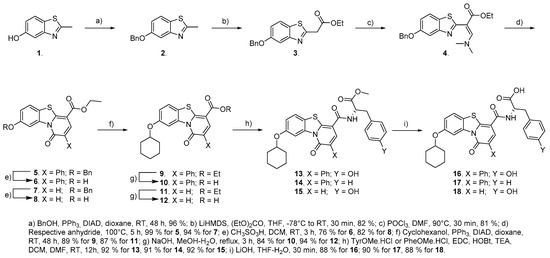 Although the synthesis of HeE1-2Tyr (16) and its derivatives has been well documented by work of Tarantino et al., we devised a modified approach in order to have easier access to a broader range of substituents in the 8-OH position of the benzothiazolo pyridinone (Scheme 1). To achieve this goal, we decided to protect the 5-OH group of the benzothiazole throughout the stages of central core construction. This way, the alkyl substituent could be introduced by the Mitsunobu reaction just prior to the introduction of the amino acid residue. After initial experiments with a TBDMS, which proved difficult to install and not very stable, we decided to use benzyl for this purpose. The 2-methyl group was then converted to an ethyl acetate by a reaction of an appropriate salt with ethyl carbonate. By using LiHMDS we achieved a very good yield in a short reaction time compared to methods using sodium hydride. A dimethylaminomethylene group was then introduced by the Vilsmeier–Haack reaction, and the pyridinone ring was subsequently closed by heating compound 4 with a neat acyl anhydride—acetic or phenylacetic. The benzyl group was comfortably cleaved using methansulfonic acid, providing compounds suitable for the Mitsunobu reaction, which afforded products 9 and 11, respectively. Workup of compounds 5–8 proved to be very easy, as these compounds are very poorly soluble, and reaction conversions are high. The rest of the synthesis was performed in a similar way as reported by Tarantino et al. An ethyl ester function was saponified, and L-Tyrosine and L-Phenylalanine methylesters, respectively, were connected to the free carboxylic acid by EDC-HOBt peptide coupling. This set of conditions proved to provide the best yields in the short optimization we performed. This procedure gave HeE1-2Tyr (16), as well two novel analogues 17 and 18, in excellent yields. Detailed descriptions of the synthesis is provided in the Supplementary File.