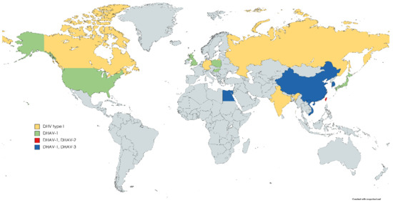 Three serotypes/genotypes (DHAV-1, DHAV-2 and DHAV-3) of DHAV have been distinguished by serological and phylogenetic analyses. Outbreaks of DHAV-1 have been reported in many parts of the world, whereas DHAV-2 and DHAV-3 seemed to be geographically restricted to East and South Asia, although a DHAV-3 outbreak has recently been reported in Egypt (Figure 1) [1,2,6,7,8,9,10,11,12,13,14,15,16,17,18].