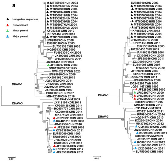 GenBank sequence records were collected in November 2020 and checked for new entries in May 2021. In total, 114 DHAV-1 (58 complete genomes and 56 VP1 genes) and 24 DHAV-3 (all complete genomes) sequences with available information on the date and place of collection were retrieved from GenBank. The time of origin of downloaded reference sequences encompassed a period from 1993 to 2020; sequences originated from Asia (China, Taiwan, Korea, Vietnam) and Africa (Egypt). Sequence data from the Hungarian DHAV-1 strains were generated during 2020.