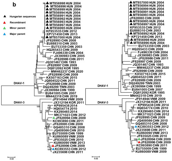 In three Chinese DHAV-1/DHAV-3 intergenotype recombinants (Recombination event 1 in Table 2, Figure 2a), an ~800 nt long fragment of the 5′ genomic regions shared high sequence identity with DHAV-1 sequences (GenBank acc. no., JF828997), whereas the remaining 7 kb long genomic regions were aligned with DHAV-3 sequences (GenBank acc. no., JX235698, KC993890, GQ485310, KC893553). The recombination crossover involved the VP0 capsid-encoding region of the polyprotein in these strains. The viral protein VP0 has marked immunogenic features; thus, changes in the corresponding genomic region may contribute to immune escape mechanisms and also may influence vaccine development [5]. Of interest, although the sequence divergence within the DHAV-1 origin VP0 of Chinese intergenotype recombinants was negligible, the DHAV-3 origin genomic fragments showed marked variation, with 95.8% to 99.8% sequence identity with each other and their respective homologous sequences. This finding is consistent with the hypothesis that multiple independent DHAV-3 field strains acquired the VP0 region of a single circulating DHAV-1 parent. Of interest, an intragenotype recombination event (Recombination event 2 in Table 2, see also Figure 2b) affected a ~1300 nt long part of the 3A–3D region of the above-mentioned recombinant strain (GenBank acc. no., JF828996), in which case the major parent may have been a DHAV-3 strain very similar to a reference strain collected in China in 2012 (GenBank acc. no., KC893553), whereas the minor parent may have been another intergenotype recombinant strain (GenBank acc. no., JF828994). Strains very similar to the Hungarian strains (GenBank acc. no., MT856991 to MT857000) were also predicted to serve as putative major parents in a recombination event (Recombination event 3 in Table 2) donating a ~190 nt long fragment of the VP0 coding region to a strain collected in China in 2003 (GenBank acc. no., EU888310); in this case, the putative minor parent was similar to a strain collected in Taiwan in 2003 (GenBank acc. no., DQ249299). Although only two methods of analysis supported this event, the sequence and phylogenetic analyses (data not shown) also suggested a historic recombination event.