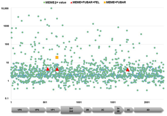 Next, we omitted all putative recombinants whose inclusion could have affected subsequent analyses. In the investigation of Darwinian evolution, we focused on DHAV-1, where all Hungarian strains belonged. Selection constraints were calculated for the DHAV-1 coding sequences with various models. The overall dN/dS ratio was low (≤0.159) for the polyprotein region and single genes. Positive selection was predicted to act at some aa sites, primarily in the capsid-coding VP0, VP3 and VP1 regions (Figure 3). Applying strict statistical settings, four sites were highlighted in the coding region as potential sites under positive selection constraints, including aa542 (S49PLT in VP1), aa676 (Q183RGHY in VP1), aa680 (D187VG in VP1) and aa1719 (Q104HR in 3C) of the polyprotein (Figure 3). The aa sites 183 and 187 belong to the hypervariable region of the VP1; aa substitutions of this region were connected to changes in virulence. Furthermore, changes at other sites of the VP1, as well as the VP0 and VP3 regions, may affect the virulence or facilitate immune escape mechanisms [1,29,30,31].