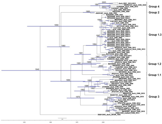In time-scaled phylogenetic analyses of DHAV-1 sequences, some bias in sample selection was seen, given that sequences were available for strains collected over a 24-year period (and only three sequences were from before 2000) and represented only three major geographic areas: Far East Asia, North Africa and Central Europe (Figure 4). Nonetheless, the analyses showed that China may be a hotspot for the diversification of DHAV-1, with at least 60 years of evolution of the major genetic groups (GG) and subgroups (SG) of DHAV-1 [34]. Analyzing sequences of the Hungarian DHAV-1 strains, the only representative sequences from Europe, suggested that DHAV-1 was introduced on at least four occasions during the 2004–2005 Hungarian outbreak; their common ancestors had an estimated TMRCA in the late 1990s and shared an origin with multiple minor Chinese clusters whose representative strains circulated in the early 2000s and 2010s. All these strains belonged to SG 1.3; the viral genomic sequences within SG 1.3 shared 95.8–99.9% identities. The first group of Hungarian sequences (MT856996 and MT856998) showed a maximum of 99.4% identity with the closest-related reference sequences, whereas sequence identities were 99.2% (MT856991, MT856994, MT856995, and MT856997) and 99% (MT856992, MT856993, MT856999 and MT857000) for other groups of Hungarian isolates. Additionally, sequences collected from heterologous hosts clustered in a common branch (within GG 3) in the time-calibrated phylogenetic tree, a cluster which is estimated to have separated from other GG 3 strains in the late 1970s. This cluster mainly contains sequences collected after 2010 and, referring to the host spectrum, might more readily jump from the common host to a heterologous host. Another genetic group, GG 4, evolved independently from GG 1 to GG 3 strains, and contains now multiple strains from Egypt and China.