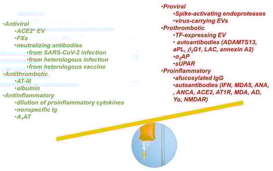 Visual representation of the different beneficial and detrimental co-factors potentially contained in a convalescent plasma unit. EV—Extracellular vesicles; A1AT—Alpha1-antitrypsin; TF—Tissue factor.