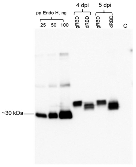 Western blot analysis of the expression of RBD (receptor binding domain) and co-expression of RBD with bacterial Endo H in N. benthamiana. N. benthamiana plants were infiltrated with pEAQ-RBD or with pEAQ-RBD/pGreenII-Endo H (non-tagged) constructs, to produce glycosylated RBD (gRBD) or in vivo deglycosylated RBD (dRBD) of SARS-CoV-2, respectively. Leaf samples were collected at 4 dpi and 5 dpi (days post-infiltration) and were homogenized in three volumes of extraction buffer. RBD protein bands were probed using the anti-4×His tag mAb. Purified plant-produced FLAG-tagged Endo H protein (~30 kDa, 25, 50, and 100 ng) was used as a standard protein. C—crude extract prepared from a control, non-infiltrated plant. gRBD—glycosylated RBD; dRBD—deglycosylated RBD; pp-plant produced.