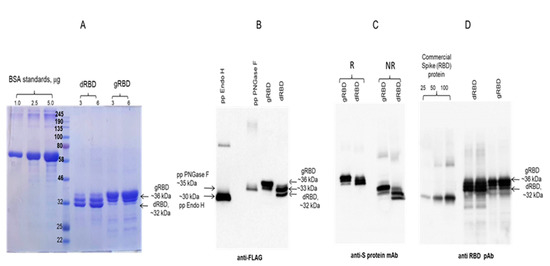 SDS-PAGE analysis of purified plant-produced gRBD and dRBD proteins. RBD protein variants were purified from N. benthamiana using anti-FLAG antibody resin. (A) gRBD—3 or 6 μg plant-produced glycosylated RBD; dRBD—3 or 6 μg plant-produced deglycosylated RBD; BSA standards—1.0, 2.5 and 5.0 μg; M—color prestained protein standard (NEB). (B) Western blot analysis of gRBD and dRBD using anti-Flag antibody: pp Endo H—plant-produced and purified Endo H protein with molecular mass of ~30 kDa [37]. pp PNGase F—plant-produced and purified PNGase F protein with a molecular mass of ~35 kDa [36]. (C) Western blot analysis of gRBD and dRBD using commercially available, purified anti-SARS-CoV-2 S protein S1 mAb (cat. no. 945102, BioLegend). (D) Western blot analysis of gRBD and dRBD using commercially available anti-RBD antibody (cat. no. MBS2563840, MyBiosource, San Diego, CA, USA); commercial spike protein—COVID 19 spike protein (RBD) active protein, sequence positions Arg319–Phe541 (MBS2563882, MyBiosource); pp—plant-produced; R—reducing; NR—non-reducing condition.