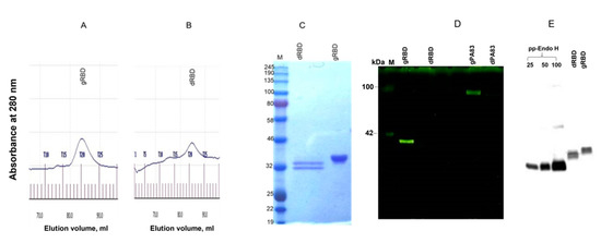 Gel filtration chromatography and glycan detection of plant-produced gRBD or dRBD proteins. Profiles of plant-produced gRBD (A) and dRBD (B) proteins, eluted from Sephacryl® S-200 HR column. The column was equilibrated with 50 mM phosphate buffer (with 150 mM NaCl, pH 7.4). The plant-produced dRBD and gRBD proteins (0.25 mg), purified using FLAG affinity chromatography, were loaded onto column. Gel filtration was performed with ÄKTA start using 60 cm × 16 mm column (cat. no. 19-5003-01, GEHealthcare, Chicago, IL, USA), packed with Sephacryl® S-200 HR (cat. no. 17-0584-10, GE Healthcare). (C) SDS-PAGE analysis of plant-produced gRBD and dRBD proteins eluted from Sephacryl® S-200 HR column. (D) Glycan detection in gRBD and dRBD proteins. Protein (250 ng) from each sample (eluted from Sephacryl® S-200 HR column) was separated on a 10% SDS-PAGE gel followed by in-gel glycan detection using the Pro-Q Emerald 300 glycoprotein staining kit. Stained proteins were visualized by UV illumination. M—CandyCane glycoprotein molecular weight standards (Molecular Probes), 250 ng of each protein per lane; gRBD—glycosylated RBD; dRBD—deglycosylated RBD; gPA83—glycosylated PA83; dPA83—deglycosylated PA83. (E) Western blot analysis of the same sample using the anti-FLAG antibody. Purified Endo H protein (25, 50, and 100 ng) and gRBD or dRBD proteins (50 ng) were loaded into wells.