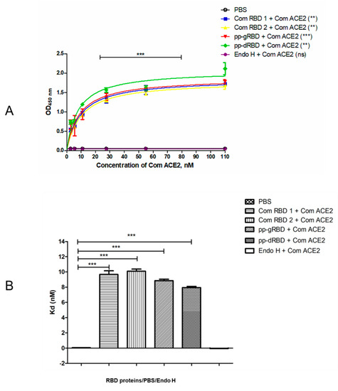 Binding of plant-produced gRBD and dRBD proteins, along with commercial RBDs, to ACE2 was assessed as described in Materials and Methods. As can be seen from Figure 4, the plant-produced RBD variants demonstrated specific binding to ACE2, the SARS-CoV-2 receptor. Notably, Endo H in vivo deglycosylated RBD exhibited a slightly stronger binding (Kd = 7.88 ± 0.062 nM) to ACE2 compared with its glycosylated (Kd = 8.816 ± 0.054 nM) counterpart.
