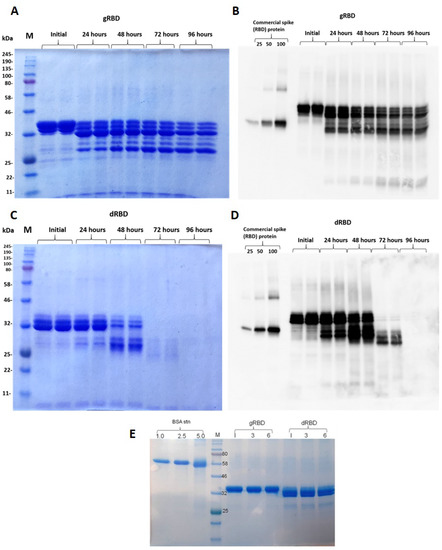 The stability of gRBD and dRBD of SARS-CoV was assessed by SDS-PAGE analysis after incubation at 37 °C for 24, 48, 72, and 96 h. The procedure is described in Materials and Methods. These analyses showed that dRBD degradation was very low during incubation at 37 °C for 24 h (less than 10%); however, under the same conditions, gRBD degraded significantly (more than 60%) (Figure 5). There was almost no degradation of plant-produced gRBD or dRBD proteins when stored at −80 °C for 6 months (Figure 5E).