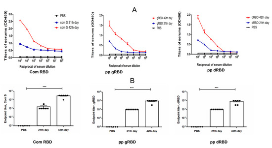 Immunogenicity of plant-produced RBD variants in mice. Mice (6–7-week-old Balb/c male) were immunized on days 0 and 21 IM with 5 μg (with alum) of plant-produced gRBD and dRBD using Alhydrogel as an adjuvant. IgG titers were determined by ELISA in sera collected on days 21 or 42 post-vaccination from mice immunized with plant-produced gRBD and dRBD. For immunogenicity analysis, 102 to 108 dilutions of sera were assessed by ELISA. Endpoint titer refers to reciprocal serum dilutions that give a mean OD value four times greater than the pre-immune control samples. Control group received PBS with Alhydrogel. (A) Detection of the SARS-CoV-2 RBD-specific IgG in different dilutions of sera from day 21 or 42. (B) Detection of IgG titers in the murine serum with different dilutions specific to commercially available S protein, gRBD, dRBD at day 21 or 42. Each point on the graph was derived from three replicas for each dilution. Data are shown as mean ± standard error of the mean (SEM) of triplicates in each sample dilution. Statistical significance (p < 0.05) was calculated using the one-way ANOVA test with Tukey’s multiple comparisons. *** p < 0.001 (n = 6 mice/group).