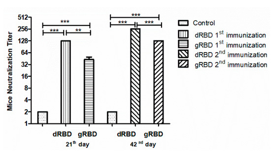 In vitro microneutralization assay of mouse sera against live SARS-CoV-2 in the Vero E6 cell line immunized with plant-produced gRBD or dRBD. In the assay, 32 to 1024 dilutions of the sera were used. Statistical significance (p < 0.05) was calculated using the one-way ANOVA test. ** p < 0.01; *** p < 0.001; n = 6 mice/group.