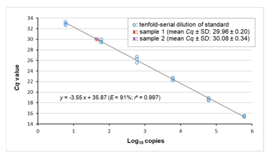 Viral loads of samples #1 and #2 matched the quantitative dynamic range of the assay. The standard curve was obtained by plotting the Cq values of serial standard dilutions against the decadic logarithm of the respective copy-number concentration. r: Pearson’s correlation coefficient.