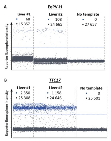 Detection of EqPV-H (A) and the cellular calibrator gene TTC17 (B) by dPCR in liver samples #1 and #2. Each panel represents a separate experimental chamber on a chip where the reaction mix containing DNA from liver samples (1:20 dilution for TTC17) was segregated into individual droplets and assessed for the presence of EqPV-H and TTC17. •: positive samples; •: negative signals, respectively. The blue line designates the arbitrary fluorescence threshold separating the signals from background.