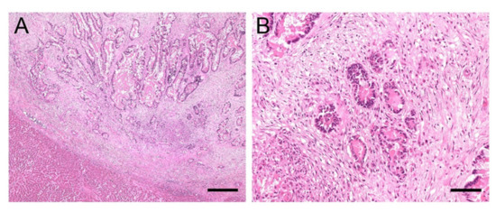 (A,B). Histology of liver sample #1: Adenocarcinoma metastases. (A): Sharply demarcated infiltration of epithelial tumour cells arranged in tubules surrounded by intensive desmoplasia. Mucus secretion can be seen within the tubules; bar = 400 µm. (B): Single-layered tumour cells containing round or ovoid, basal oriented nuclei (B); bar = 80 µm.