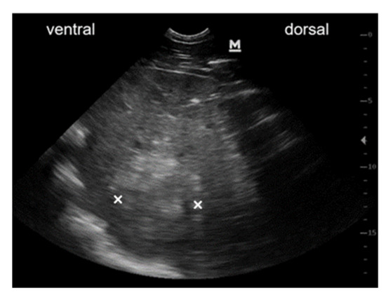 Ultrasonographic image of mass within liver parenchyma. Ultrasonographic image obtained from the right 14th intercostal space of the abdomen at the costochondral border. Liver tissue is highly inhomogeneous with a rounded, hyperechoic and weakly circumscribed mass within the liver parenchyma (×: dorso-ventral expansion of the mass).