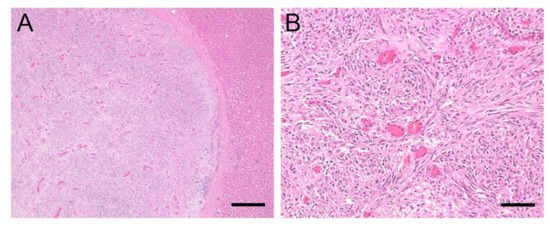 (A,B). Histology of liver sample #2: Perivascular wall tumour. (A): The masses found in the liver were comprised of malignant, mesenchymal spindle cells, separated by collagenous stroma; bar = 400 µm. (B): The tumour cells are arranged in a pericapillar and perivascular whorling pattern, bar = 80 µm.