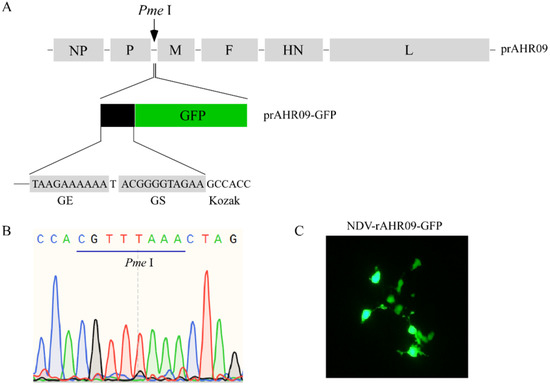 In order to construct a basal NDV vector to express the exogenous gene, we inserted a Pme I restriction enzyme cutting site between P and M genes on the prAHR09 plasmid. After prAHR09-Pme I was cut with Pme I, a seamless cloning method was used to insert the GFP expression cassette, which contained the GE, GS, and Kozak sequence ahead of the GFP gene. The schematics of the construction of prAHR09-GFP are shown in Figure 1A, and the verification of Pme I insertion into prAHR09 is shown in Figure 1B. Finally, the prAHR09-GFP plasmid was co-transfected with the three helper plasmids, and the fluorescence of the recombinant NDV rAHR09-GFP strain is shown in Figure 1C.
