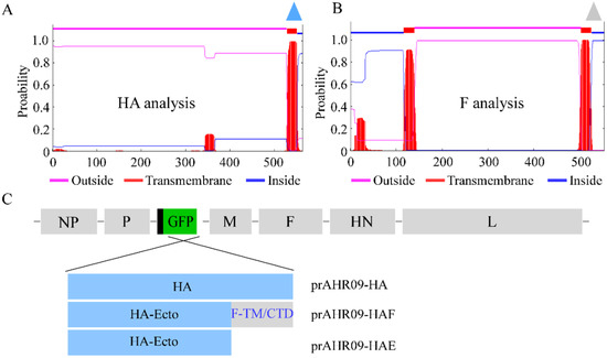 Schematics for the construction of three recombinant NDVs. (A,B) The transmembrane domain analysis of the H9N2 AIV HA protein and NDV HR09 F protein (http://www.cbs.dtu.dk/services/TMHMM/, accessed on 24 June 2017). (C) The schematics for the construction of the different forms of HA that replace the GFP gene in prAHR09-GFP plasmid. The plasmid containing the full-length HA was designated prAHR09-HA. The plasmid with the chimeric HA ectodomain fused with the transmembrane domain and C-terminal cytoplasmic tail domain from F protein of NDV was designated prAHR09-HAF. The plasmid with HA ectodomain was designated prAHR09-HAE.