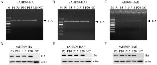 To assess the stability of the recombinant NDVs, the recombinant NDVs were propagated in embryonated chicken eggs for 20 passages. Firstly, passages 1, 5, 10, 15, and 20 were chosen to check the existence of the HA gene using the PCR method. The results showed that rAHR09-HA (Figure 3A), rAHR09-HAF (Figure 3B), and rAHR09-HAE (Figure 3C) contained the HA gene in all passages. In addition, passages 5, 10, 15, and 20 were chosen and propagated in CEF cells to check the expression of the HA gene using the WB method, and the results showed that all the passages of the three recombinant rAHR09-HA (Figure 3D), rAHR09-HAF (Figure 3E), and rAHR09-HAE (Figure 3F) could express the HA protein, which indicated that the three recombinant NDVs could stably express the HA gene.