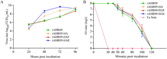 Biological characteristics identification of recombinant NDVs. (A) The CEF cells in 6-well plates were incubated with rAHR09, rAHR09-HA, rAHR09-HAF, and rAHR09-HAE at an MOI of 0.1, respectively. The cells’ supernatants were harvested at 24, 48, 72, and 96 hpi, then the virus titer was determined using the TCID50 method in CEF cells. (B) Each NDV recombinant virus was separately incubated for 30, 40, 50, 60, 80, 100, and 120 min under 56 °C. Then, the HA titer of each treated recombinant NDVs was measured.