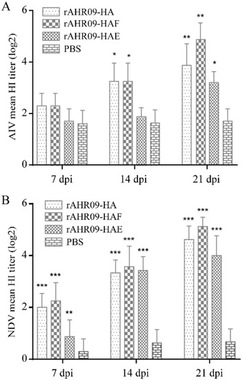 Serum antibody titer induced by recombinant NDVs in SPF chickens. Seven-day-old SPF chickens were separately immunized with 106EID50 rAHR09-HA, rAHR09-HAF, and rAHR09-HAE. The serum was collected at 7, 14, and 21 dpi. (A) HI antibody titer against H9N2 AIV. (B) HI antibody titer against NDV. Values are shown as mean values ± standard deviation (mean ± SD) in each group (* p < 0.05, ** p < 0.01, *** p < 0.001).