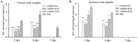 QRT-PCR quantitation of H9N2 AIV viral shedding in challenged chickens. The chickens were challenged with the 108EID50 H9N2 AIV YZ1406 strain at 21 days post-immunization. Cloacal swab samples (A) and tracheal swab samples (B) were collected 3, 6, 9 days post-challenge, and the levels of H9N2 AIV viral RNA were quantitated via QRT-PCR. Values are shown as mean values ± standard deviation (mean ± SD) in each group (* p < 0.05, ** p < 0.01, *** p < 0.001).