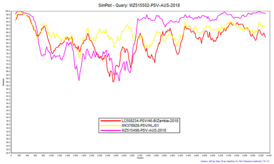 Similarity plot generated in SimPlot using the sequence MZ515502-PSV-AUS-2018 (Pig 46 Colon) as the query sequence against three other sequences using a 200 nucleotide sliding window at 20 nucleotide intervals and the F84 distance [64] model with the maximum likelihood method. Percentage identities at each analysis point were plotted on a line chart. For similarity plot analysis, the y-axis shows the percentage similarity between the reference sequences and the query sequence. Different colours are indexed for different reference sequences.