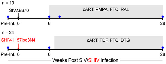 Male rhesus macaques (RM) were infected intravenously (i.v.) with 100 TCID50 SIVΔB670 (n = 19) or 9500 TCID50 of SHIV-1157ipd3N4 (n = 24), as previously described [9]. SIV-infected RMs received cART at 6 weeks post-infection (wpi), consisting of subcutaneous (s.c.) daily doses of 9-(2-Phosphonyl-methoxypropyly) adenine (PMPA; Gilead Sciences, Foster City, CA, USA), 2′,3′-dideoxy-5-fluroro-3′-thiacytidine (FTC, Gilead Sciences, Foster City, CA, USA), and oral raltegravir (RAL, Merck & Co., Kenilworth, NJ, USA), as previously described [11]. At 7 wpi, SHIV-infected RMs were given s.c. daily doses of 5.1 mg/kg tenofovir disoproxil fumarate (TDF), 50 mg/kg emtricitabine (FTC), and 2.5 mg/kg dolutegravir (DTG) (Gilead Sciences, Foster City, CA, USA). All animals were housed at the Washington National Primate Research Center (WaNPRC) and all experiments performed on the RMs were approved by the University of Washington’s Institutional Animal Care and Use Committee (IACUC) and were completed in compliance with the U.S. Department of Health and Human Services Guide for the Care and Use of Laboratory Animals and Animal Welfare. Vital signs of the animals were monitored throughout the course of infection for simian AIDS or for adverse reactions associated with the cART regimen under WaNPRC guidelines [11]. Under sedation, blood was collected every 1–4 weeks and colonic pinch biopsies were collected prior to infection (−4 to −2 wpi), during acute infection/prior to initiation of cART (6 wpi), and at 2 weeks (8wpi, SIV only) and 21–22 weeks (28 wpi) after cART initiation, as previously described [11,18]. Lymphocytes were isolated from colon biopsies, as previously described [11].