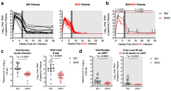 SHIV-infected macaques have lower viral burden and better viral control during cART therapy. (a,b) Plasma SIV or SHIV (viral RNA levels at each timepoint were measured by RT-PCR (SIV) or qRT-PCR (SHIV). The dotted line indicates the limit of detection (30 copies/mL of plasma). Hashed and shaded regions indicate periods of cART treatment for SIV RMs and all animals, respectively. Lines indicate individual animals (a) or medians with interquartile ranges (b). (b) Kruskal–Wallis test, adjusted p-values are given. (c) Area under the curve (AUC) of plasma viremia during acute infection (0–6 wpi) (left panel) and viral load at 6 wpi (right panel). (d) AUC of plasma viremia during cART treatment (9–28 wpi) (left panel) and viral load 21–22 weeks on cART (right panel). (c,d) Individual RMs are indicated by circles: SIV (black open circles), SHIV (red open circles). Medians with interquartile ranges are indicated. p-values were determined using a Mann–Whitney Test, with * p-values ≤ 0.05 considered significant.