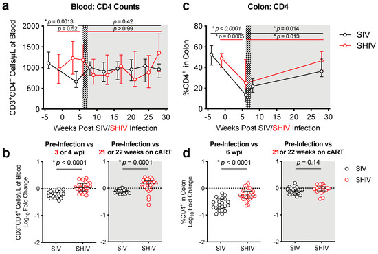 Peripheral and mucosal CD4 depletion in SIV-infected, but only mucosal depletion in SHIV-infected macaques. (a) CD4+ T-cells in the blood were quantified from the complete blood count (CBC) following flow cytometry analysis. (c) The frequency of CD4+ T-cells within the CD45+ T-cell subset from colon biopsies was determined by flow cytometry. (a,c) Hashed and shaded regions indicate periods of cART treatment for SIV RMs and all animals, respectively. Lines indicate medians with interquartile ranges. Kruskal–Wallis test, adjusted p-values are given. (b,d) Log10-fold change in CD4 T-cells between pre-infection and acute infection at 3 (SHIV) or 4 (SIV) weeks post-infection (wpi) or after 21 (SHIV) or 22 (SIV) weeks (>5 months) on cART in the blood (b) or colon (d) between SIV (black open circles) and SHIV (red open circles). Each dot represents an individual RM with medians and interquartile ranges indicated. The dotted line indicates no change (value of 1). p-values were determined using a Mann–Whitney test, with * p-values ≤ 0.05 considered significant.