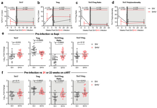 Higher viral burden during acute SIV infection and during cART is associated with greater gut dysfunction. (a,b) The percentage of Th17 (IL-17+) (a), stimulated with PMA and ionomycin, or unstimulated Tregs (FoxP3+CD25+) (b) of CD4+ T-cells in the colon was determined by flow cytometry (as described in methods). (c) The Th17/Treg ratio was determined by dividing the percentage of IL-17+ of CD4+ cells by the percentage of FoxP3+CD25+ of CD4+ cells. (d) Polyfunctional Th17 (Th17 Poly.) cells were identified as the percentage IL-17+ cells that produced at least two additional cytokines (IL-22, IFNγ, TNFα, or IL-2) as determined by Boolean gating following in vitro stimulation with PMA and ionomycin. (a–d) Hashed and shaded regions indicate periods of cART treatment for SIV RMs and all animals, respectively. Lines indicate medians with interquartile ranges. Kruskal–Wallis test, adjusted p-values are given. (e–f) Log10-fold change in cells in the colon between pre-infection and acute infection or 21–22 weeks (>5 months) on cART between SIV (black open circles) and SHIV (red open circles). Each dot represents an individual RM with medians and interquartile ranges indicated. The dotted line indicates no change (value of 1). p-values were determined using a Mann–Whitney test, with * p-values ≤ 0.05 considered significant.