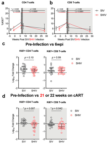 Incomplete viral suppression during cART in SIV-infected macaques is associated with greater gut immune activation. (a,b) Immune activation was measured as the percentage Ki67+ of CD4+ (a) or CD8+ (b) T-cells in the colon as determined by flow cytometry (as described in methods). (a,b) Hashed and shaded regions indicate periods of cART treatment for SIV RMs and all animals, respectively. Lines indicate medians with interquartile ranges. Kruskal–Wallis test, adjusted p-values are given. (c,d) Log10-fold change in immune activation in the colon between pre-infection and acute infection or 21–22 weeks (>5 months) on cART between SIV (black open circles) and SHIV (red open circles). Each dot represents an individual RM with medians and interquartile ranges indicated. The dotted line indicates no change (value of 1). p-values were determined using a Mann–Whitney test, with * p-values ≤ 0.05 considered significant.