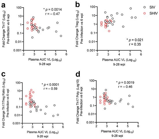 Less dysregulation of mucosal CD4 T-cells is associated with greater viral control during cART. Correlations between log10-fold change in colonic (a) Th17 and (b) Treg cell frequencies, (c) the Th17/ratio, and (d) Th17 polyfunctionality (Th17 Poly.) during acute infection (weeks 0–6) versus AUC plasma viremia during cART (weeks 9–28). Spearman’s rank correlation is shown, with * p-values ≤0.05 considered significant.