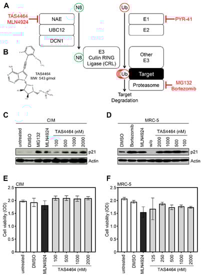 TAS4464 stabilizes CRL targets such as p21, and does not exert overt cytotoxicity. (A) Simplified overview of the conjugation of ubiquitin (“Ub”) and Nedd8 (“N8”), as well as target protein degradation through the proteasome. Inhibitors are depicted in red. Please, see the main text of the article for further details and abbreviations. (B) The molecular structure of TAS4464 (PubChem CID: 124121823) is shown. (C) C57BL/6 immortalized mouse embryonic fibroblasts (“CIM”) and (D) human MRC-5 cells were treated with MG132 (1 µM), MLN4924 (5 µM), or the indicated concentrations of TAS4464 (100–2000 nM). Solvent-treated (“DMSO”) and untreated cells served as controls. After 24 h, cells were lysed and subjected to immunoblot analysis to determine the p21 abundance. (E) CIM cells were treated with MLN4924 (5000 nM), TAS4464 (100–2000 nM), the solvent (“DMSO”), or were left untreated for 72 h. Afterwards, the cytotoxicity was determined as described in the Materials and Methods section. (F) As in (E), but human MRC-5 cells were studied.