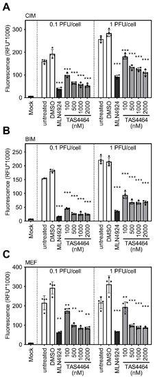 To test if TAS4464 elicits antiviral activity against cytomegaloviruses, a previously described immortalized mouse fibroblast cell line (“CIM“; see Materials and Methods section for details) was treated with MLN4924 (5 µM) as positive control or graded TAS4464 concentrations (100–2000 nM) and infected with 0.1 (left panel) or 1 PFU/cell (right panel) of an MCMV reporter mutant expressing the enhanced green fluorescent protein (“MCMV:eGFP”). Virus-induced fluorescence was quantified after three days of infection. In agreement with our previous publications, MLN4924 elicited significant antiviral activity (Figure 2A). Please note that accurate dose–response curves for the antiviral activity of MLN4924 against MCMV have been generated previously, indicating antiviral activities at nanomolar concentrations [23]. Consistent with a pronounced antiviral activity, TAS4464 treatment also significantly diminished the MCMV-induced fluorescence compared with untreated or solvent-treated control samples (Figure 2A). The effect of TAS4464 was observed irrespective of the initial dose of infection (0.1 or 1 PFU/cell). Accordingly, TAS4464 and MLN4924 also diminished MCMV-driven reporter gene expression in another immortalized mouse fibroblast cell line (“BIM”) derived from a different mouse strain (BALB/c) (Figure 2B). This antiviral activity was also observed in primary mouse embryonic fibroblasts (Figure 2C), indicating that the antiviral effects elicited by MLN4924 and TAS4464 against MCMV are neither restricted to one mouse strain nor to immortalized cell lines.