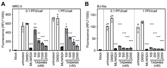 Next, the antiviral effects of MLN4924 and TAS4464 against HCMV were analyzed by a similar approach, applying an eGFP-expressing HCMV reporter virus (“HCMV:eGFP”). The HCMV-induced fluorescence was also quantified at 3 days post-infection. In agreement with our previous work, MLN4924 elicited strong antiviral activity and diminished the HCMV-induced fluorophore expression (Figure 3A, black bars). Please note that accurate dose–response curves for the antiviral activity of MLN4924 against HCMV were established in our earlier work, which indicated significant antiviral activity at concentrations as low as 100 nM [23]. Similarly, TAS4464 significantly reduced the HCMV-driven fluorescence compared with untreated and solvent-treated MRC-5 cells (Figure 3A, grey bars). The potent antiviral effect of MLN4924 and TAS4464 was corroborated by similar experiments in the HCMV-permissive fibroblast cell line BJ-5ta (Figure 3B), indicating that two different NAE inhibitory drugs strongly suppress HCMV replication.