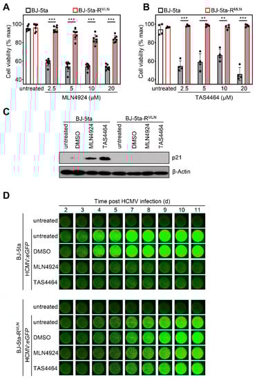 Antiviral effects elicited by MLN4924 and TAS4464 are absent in MLN4924-resistant cells. (A) BJ-5ta parental cells and MLN4924-resistant cells (“BJ-5ta-RMLN”) were exposed to increasing concentrations of MLN4924 or (B) TAS4464 to assess the cell proliferation during a 72 h period. Asterisks indicate the level of statistical significance assessed by a two-sided, heteroscedastic t test (** p < 0.01; *** p < 0.001). (C) Parental and BJ-5ta-RMLN cells were left untreated or were treated with DMSO, MLN4924 (5 µM), or TAS4464 (2 µM). Cells were lysed, and the p21 stabilization was assessed by immunoblotting analysis. (D) In addition to ruxolitinib (4 µM), BJ-5ta parental and BJ-5ta-RMLN cells were left untreated or were treated with the solvent (DMSO), MLN4924 (5000 nM), or TAS4464 (2000 nM) and briefly afterwards infected with HCMV:eGFP. HCMV-induced fluorescence activity was visualized using a Bioreader at indicated time periods after infection. The experiment was conducted in quadruplicate, and one representative well is shown.