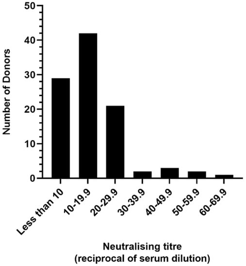 Interest in HCoVs has been renewed since the emergence of SARS-CoV-2, particularly in the effect of prior exposure to HCoVs on the outcome of subsequent SARS-CoV-2 infection [], mediated by cross-reactive humoral or cellular immunity between SARS-CoV-2 and seasonal coronaviruses []. Cross-reactive immune responses to HCoVs may complicate the interpretation of serological studies for SARS-CoV-2, and may protect against [,] or enhance [] the severity of COVID-19 disease. Recent interest in HCoVs has also focused on their potential as human challenge surrogates for SARS-CoV-2. They may be appropriate low virulence model viruses for human challenge studies to investigate the efficacy of antiviral treatments for COVID-19, and in vitro studies regarding cellular entry and responses to infection. In this context, HCoV-NL63 would be the most advantageous virus to use, as HCoV-HKU1 is difficult to propagate in cell lines, and the commercially available strains of both HCoV-OC43 and HCoV-229E are laboratory adapted high passage viruses that may not induce clinically relevant disease manifestations in humans []. However, if the population prevalence of high titre neutralising antibodies to HCoV-NL63 from which volunteers may be drawn is high, the feasibility of a challenge model may be reduced. We therefore conducted a cross-sectional study to determine the seroprevalence of neutralising antibodies against HCoV-NL63 in healthy adults in Australia.