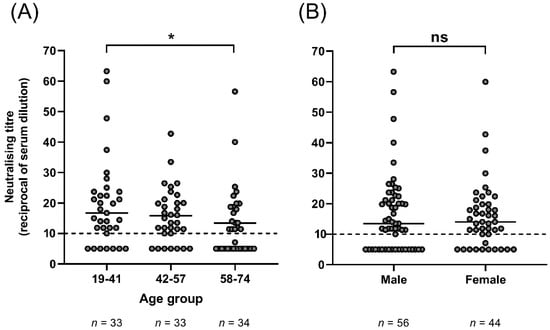 Age group (A) and sex (B) comparison of GMT. (A) 58–74 year olds demonstrated significantly lower median HCoV-NL63-neutralising antibody titre compared to 19–41 year olds (* p = 0.0485, Kruskal–Wallis test). An NT50 of 10 (1:10 dilution of plasma) was the limit of sensitivity for the assay. (B) There was no significant difference between median neutralising titres for males and females. HCoV-NL63 neutralization was detected in 38 males (68% of total males) and 33 females (75% of total females) (p = 0.98; Mann–Whitney U test).