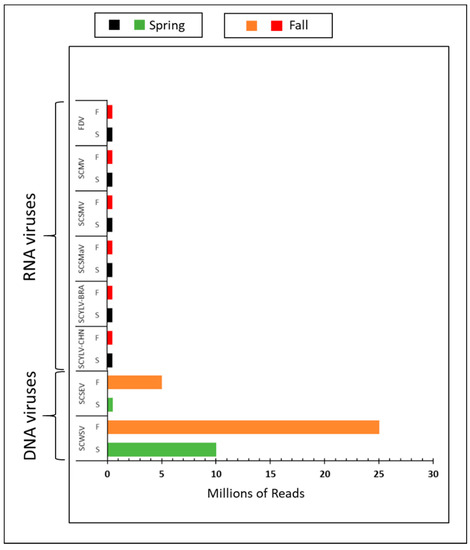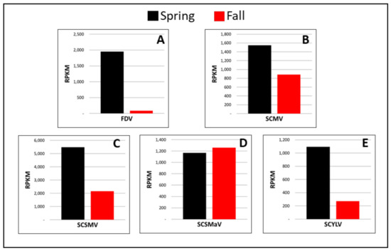 A critical component in the use of HTS as a diagnostic tool is to determine the optimum season to perform HTS during which the viral titer is higher. For this reason, RPKM-normalized viral reads, which serves as a semi-quantitative measurement of viral titer due to its high correlation with virus load within samples [44,45,46], were compared between the spring and fall seasons.