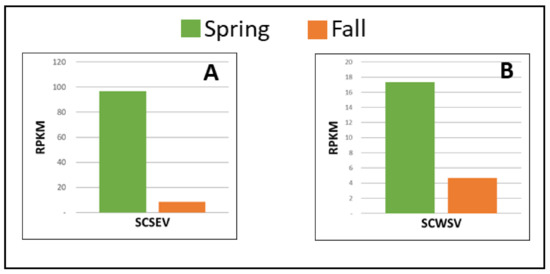 Spring and fall viral read comparison of two DNA viruses in sugarcane quarantine specimens. Viral reads are normalized as RPKM, reads per kilobase per million, to account for viral genome size [43]: (A) sugarcane streak Egypt virus (SCSEV); (B) sugarcane white streak virus (SCWSV).
