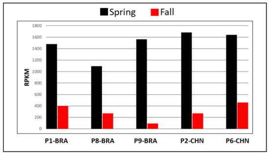 To assess the reproducibility of the RPKM variation observed in this study, we selected five single- or co-infected SCYLV specimens. These samples were imported from diverse geographical locations, allowing us to determine if this variation is independent of germplasm origin or viral genotype (Table 2). HTS analyses showed that samples P1, P8, and P9 were infected with SCYLV-BRA genotype, while samples P2 and P6 were infected with SCYLV-CHN genotype (Table 2 and Table 3). The genomic coverage for all five SCYLV isolates were above 99%, independent of the season during which the analysis was performed. RPKM values obtained from all five samples were higher in spring when compared to the fall season (Figure 4), with a fold increase between 3.58 and 16.80. The seasonal variation in viral titer was independent of viral genotype, germplasm origin, or whether the sample was single-infected (samples P8 and P9) or co-infected with SCMV (samples P1, P2, P6). Similar analysis for other viruses was not possible due to the absence of multiple sugarcane accessions carrying the other six viruses.